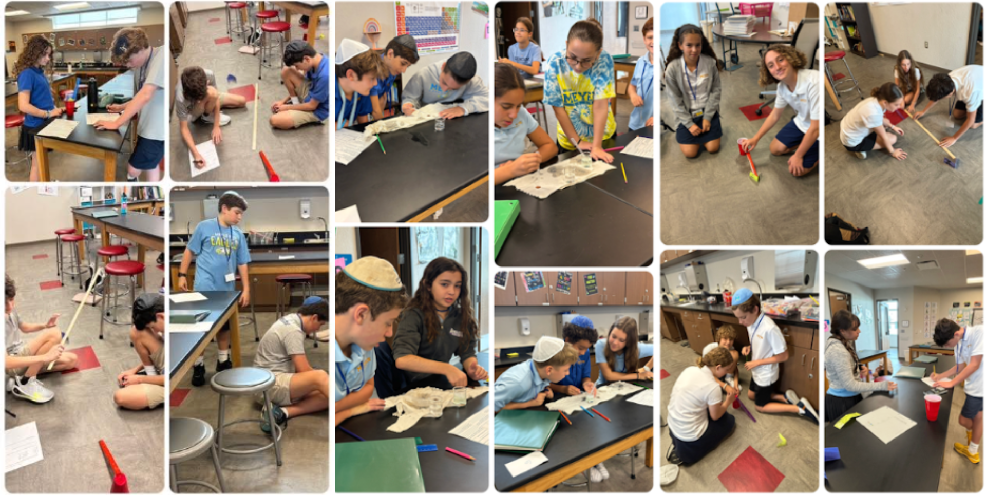Last week, middle school students put their knowledge of the scientific method into practice. Eighth graders were given supplies and had to design their own experiment. Some groups tested the effect of different-sized marbles on the distance a paper dragon travelled. Other groups tested the distance the dragon moved when the marble was released from different heights. Seventh graders tested notebook paper airplanes vs. printer paper airplanes to determine which would fly longer. Finally, 6th graders tested whether a penny could hold more drops of regular water or soapy water. Check out some great pictures below!